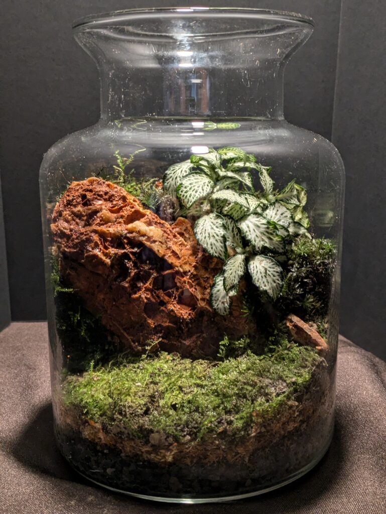 Een kleine mospot met veel karakter, een witte fittonia maakt zich thuis net achter de rode rots, omgeven door natuurlijk stermos, varenmos, en draadmos.